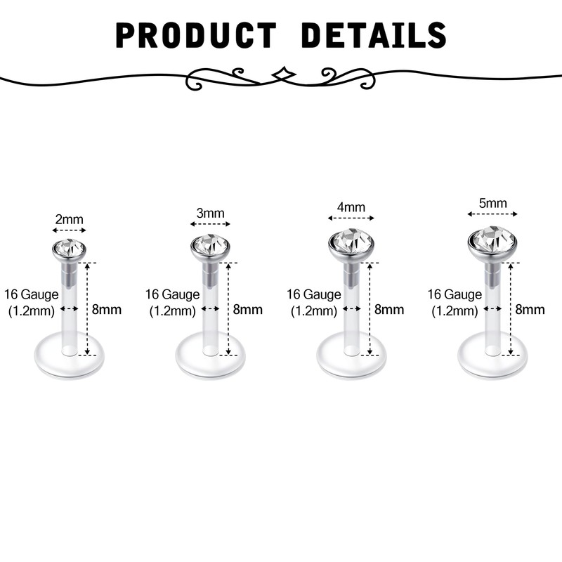 Briana Williams Lip Piercing Bioflex Labert Stud Set Transparent 16G Retainers 6/8/10 mm Bar Tragus Helix Piercing CZ Opal, Stainless Steel