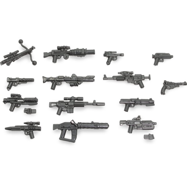 • Included are 14 different weapons: - 1x bolt caster, made of three parts - 1x T-21B, made of three parts - 1x A180 - 1x E-11 V2 with removable magazine - 1x A-280C - 1x Shocktrooper pistol