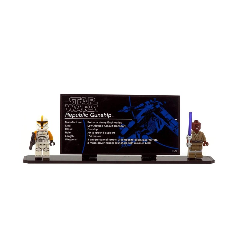 Upgrade your LEGO Star Wars collection with this display stand custom-designed to work with LEGO set 75309 - Republic Gunship. Holds your ship at a 10° angle. Includes stand for your minifigs and technical data plaque.
