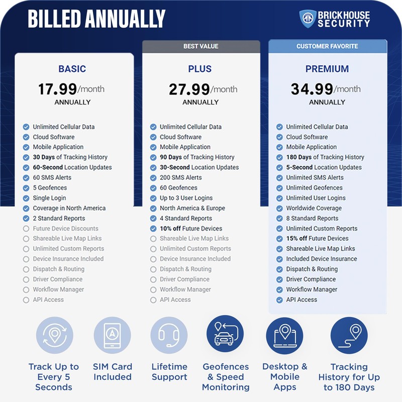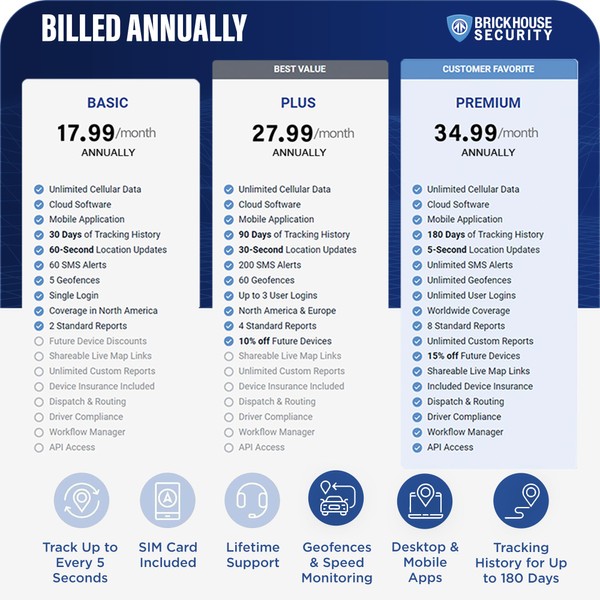 - AFFORDABLE SUBSCRIPTION PLANS: Our subscription prices start at $17.99/unit/month (billed annually) for BASIC, $27.99 for PLUS, and $34.99 for PREMIUM. You can go monthly, quarterly, or annually depending on your preference. No contracts, cancel anytime for a hassle-free experience. Our tracking device includes a Spark Nano 7.0 wall charger, a user's guide, and a pre-installed SIM card.