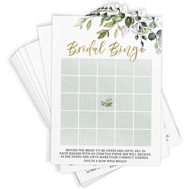 - QUALITY - Printed on our best satin finish lux paper smooth card stock. This bridal shower bingo game features a unique selection of modern typefaces to accompany the elegant gold greenery eucalyptus design.