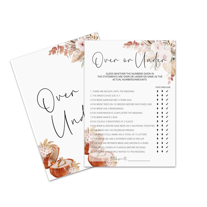 Bridal Shower Games Cards, Over or Under Themed Fall Bridal Shower Games for 25 Guests, Love is in Bloom Wedding Game, Boho Floral Bachelorette Engagement Party Favors -04