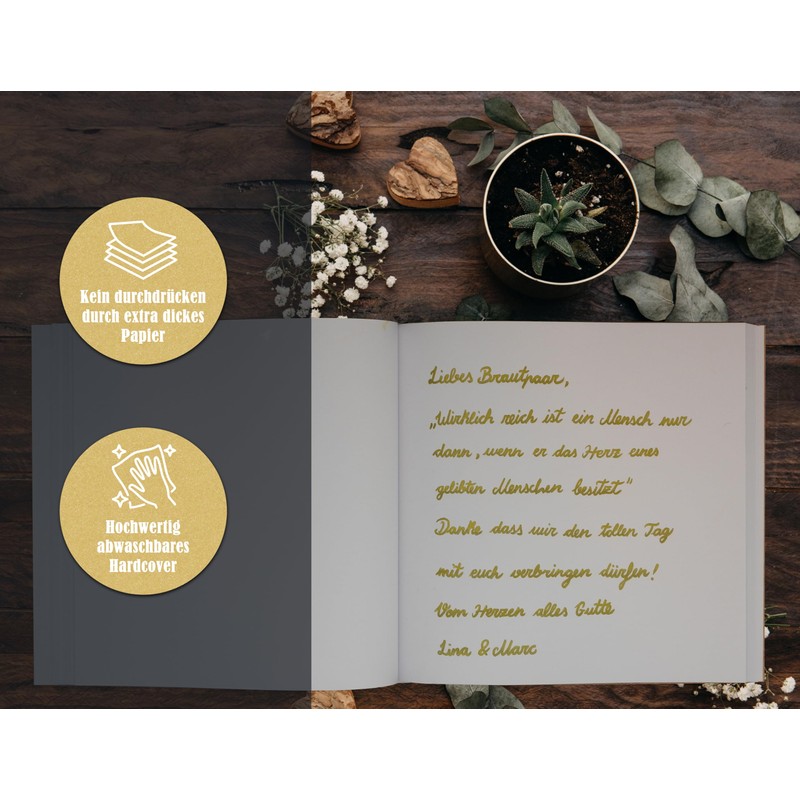 - Lots of creative space – 144 pages, with high-quality 120 g thick paper, offer space for all your guests to unfold freely in the guest book. In addition, enough space to stick beautiful photos and thus personalise the wedding guest book and transform it into a wedding photo album. The combination wedding album photo album delights even years later when looking at.