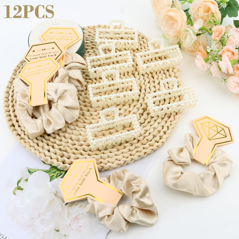 - 12 PCS Bridesmaid Proposal Gifts: This elegant bachelorette party favor set includes 12 pieces — 6 soft silk scrunchies and 6 exquisite pearl hair clips. Stylish and practical, this bridesmaid gift set is sure to make your bridal party feel extra special on your big day!