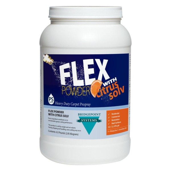 Tough stains and greasy soils don’t stand a chance with Bridgepoint Systems Flex Powder with Citrus Solv. Specially designed to handle the most challenging carpet and upholstery cleaning tasks, this 6.5 lb. powdered prespray delivers deep-cleaning, high-alkaline power enhanced by the natural strength of citrus solvents. Whether you're a seasoned professional or a meticulous homeowner, Flex Powder transforms dirty carpets into fresh, revitalized surfaces.
