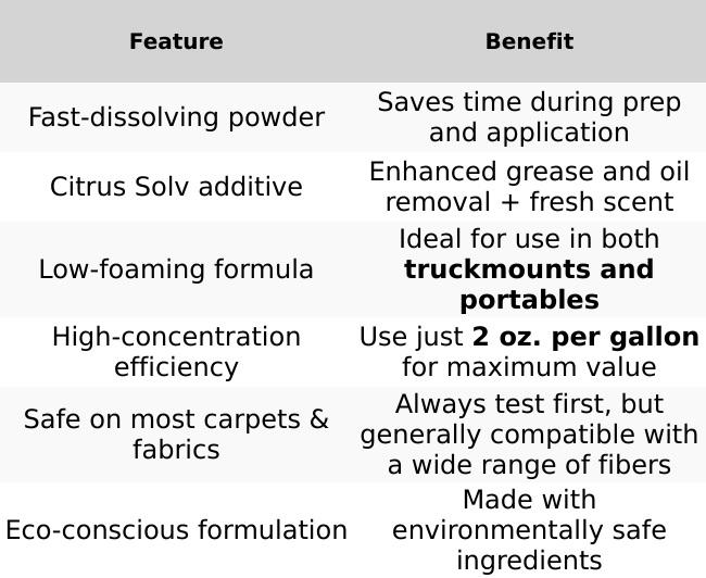 “This is hands-down my favorite prespray. It dissolves quickly, doesn’t foam up too much, and leaves carpets looking and smelling great.” — Marie T., Residential Cleaning Pro