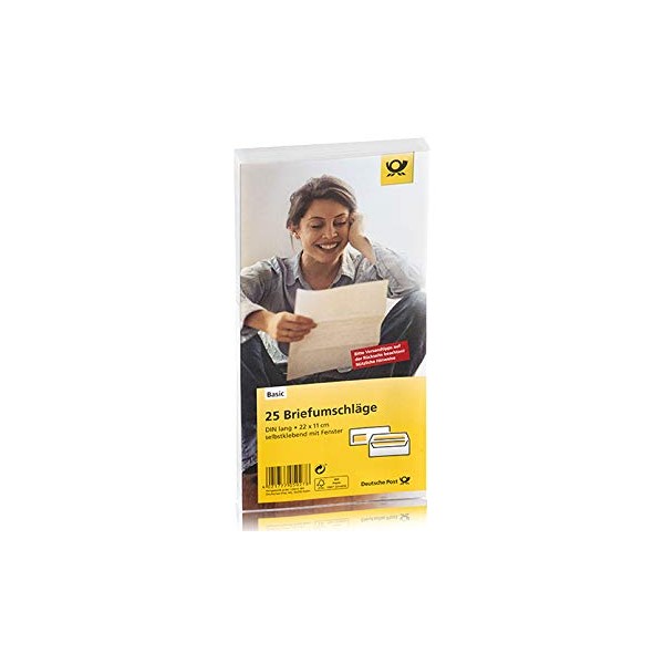 - Set of 25 envelopes in DIN long. The envelopes are made of white, wood-free paper are self-adhesive, with window. Dimensions: 22 x 11 cm, shrink-wrapped in pack of 25