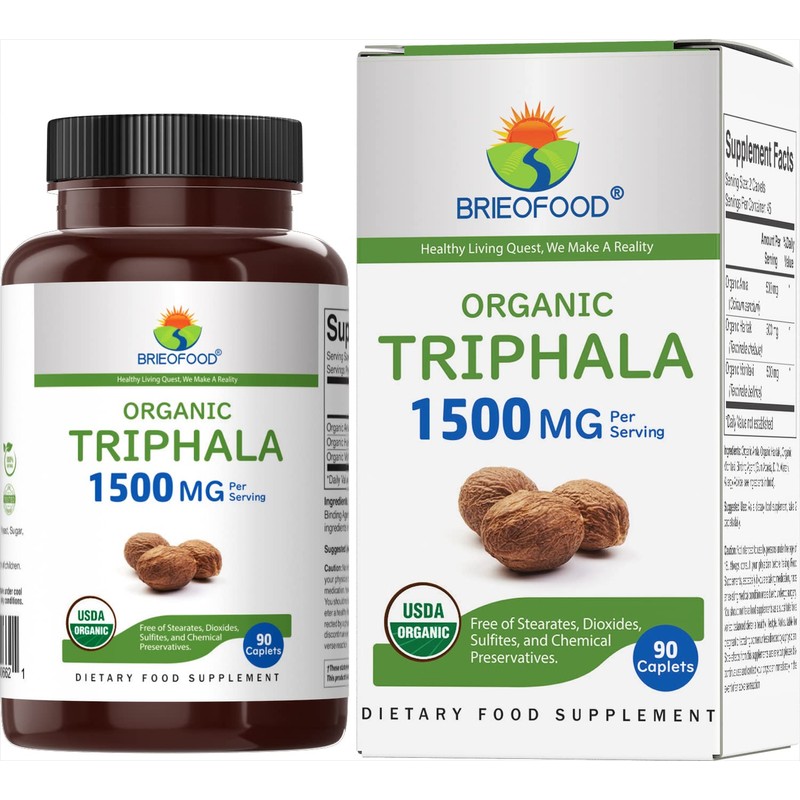 Brieofood Organic Triphala 1500mg, 45 Servings, Vegetarian, Gluten Free, 90 Vegetarian Tablets