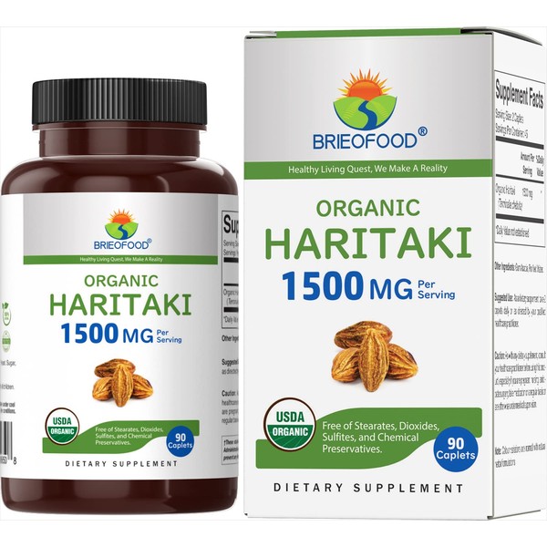 Brieofood Organic Haritaki 1500mg, 45 Servings, Vegetarian, Gluten Free, 90 Tablets