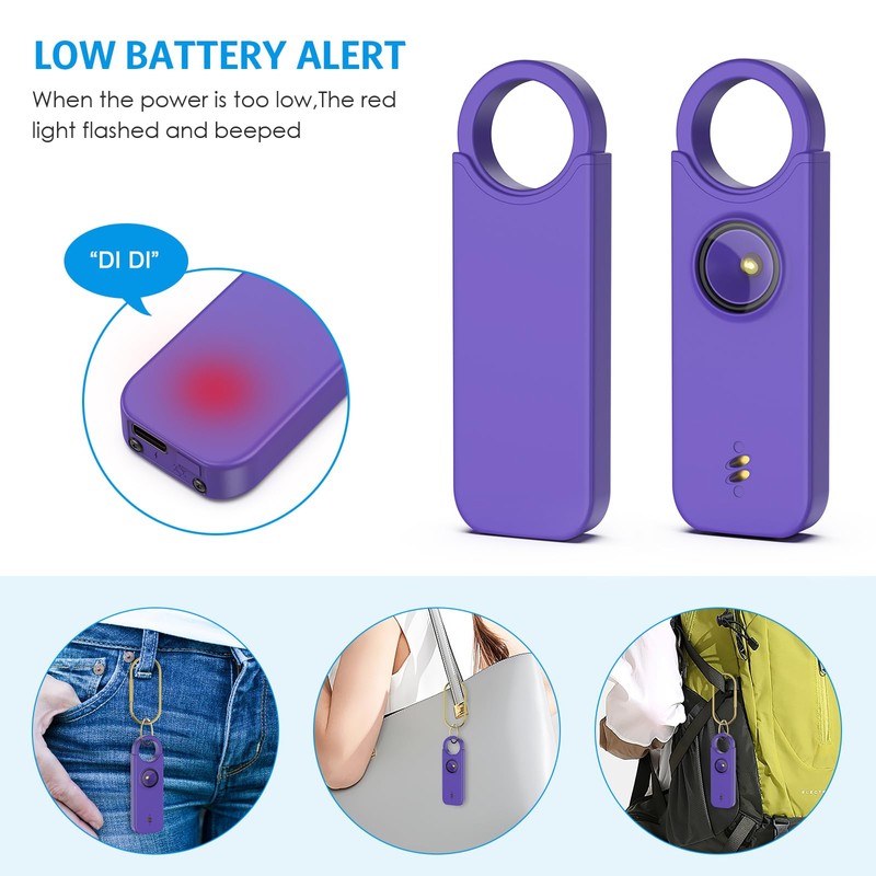 - Durable and compact: the portable personal alarm is made of high-quality, environmentally friendly and durable ABS plastic. It has a portable size for easy storage and transport. It can be attached to women's bags, backpacks, school bags, belt loops, suitcases, keys, dog belts, etc.; and you can even take it on the plane.