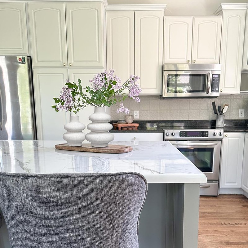 - HANDMADE CERAMIC VASES: 2 white vases are crafted of the highest quality thick ceramic, glazed inside. This Contemporary style item will be an exception among other Vases. Add a variety of dried florals, pampas grass, reeds, long stems, cut flowers, fresh bouquets (can hold water), to make the Perfect Décor Combo, or even just displayed them alone on a shelf will be an eye-catcher. This home accent will be a great centerpiece for your home!
