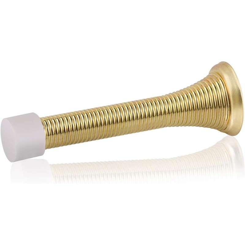 Bright brass spring door stopper with a rubber bumper designed to absorb impact and help protect walls and doors with a classic, polished look.
