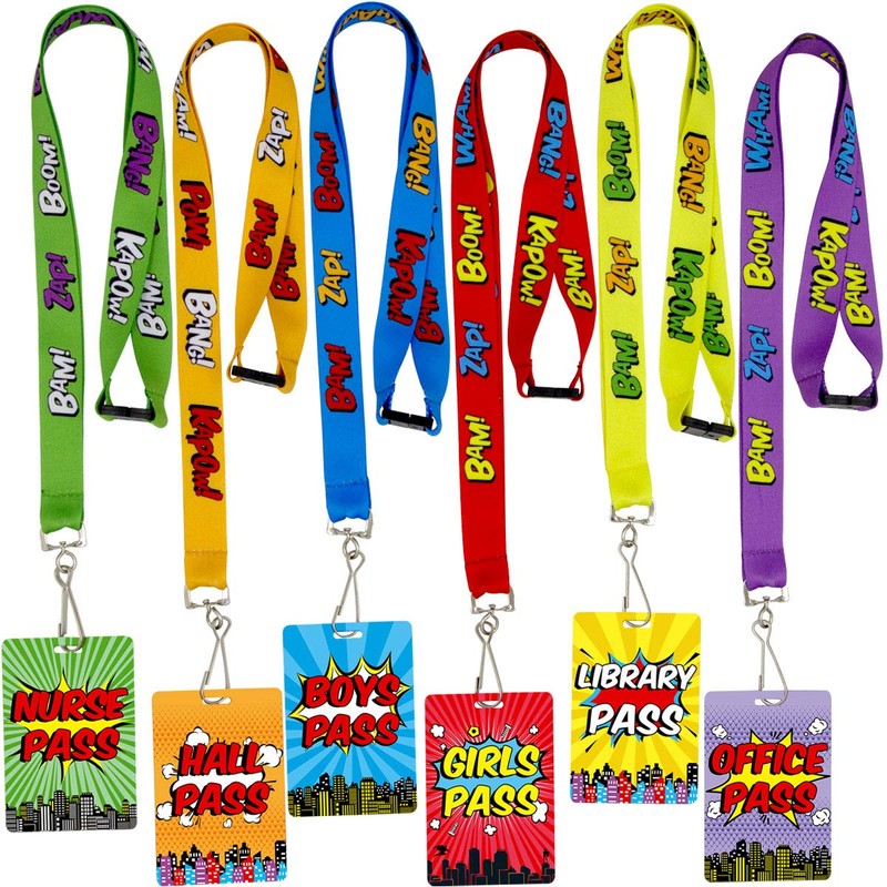 - Package Included: 6 school pass cards. Hall, nurse, office, library, boys and girls pass, and 6 lanyards. 36" polyester straps with plastic safety buckles and metal clips with 3.5" plastic tags.