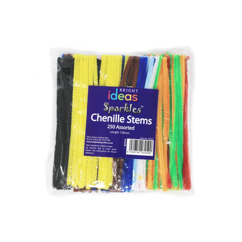 - Bright Ideas 250 assorted pipe cleaners' chenille stems are supplied flat and then supplied in a clear reusable polybag for extra protection from dust and moisture C we have 8 bright and colourful assorted packs available in the range