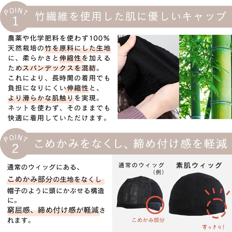 - Have you ever felt stressful when wearing a wig, such as tightness, hot or uncomfortable feeling? This wig has been developed to reduce the stress caused by wearing a wig. Introducing a new series that uses fabric from Bamboo on the inner cap of the wig. Bamboo has excellent antibacterial and antibacterial properties, as it has been used for food storage since ancient times, and prevents the growth of bacteria that can cause unpleasant odors. In addition, it absorbs about 2 times more absorbent than cotton and absorbs sweat even after sweat. Because the surface of the fiber is extremely smooth, it is difficult to generate static electricity that can damage the wig. It is the best material for the inner cap of the wig. In addition, the overall loose sizing reduces the feeling of tightness. It won't burden even when worn for a long period of time, and can be used for a variety of occasions such as as a spare wig, for a short outings, or when traveling. Available in 3 types: Short, Bob, and Medium