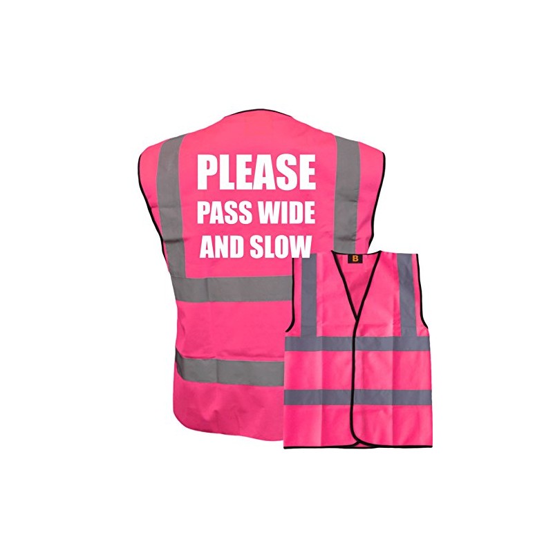 Bright Pink High Visibility Vest with White Text PLESE PASS WIDE AND SLOW DOWN - HORSE RIDING By Brook Hi Vis Small