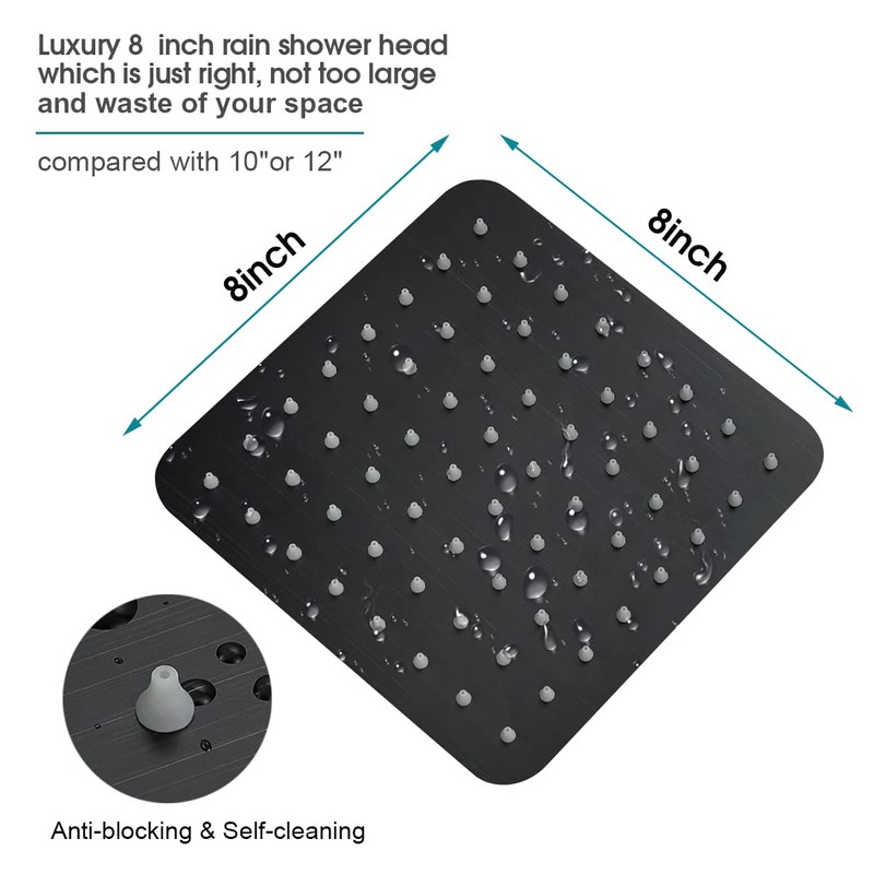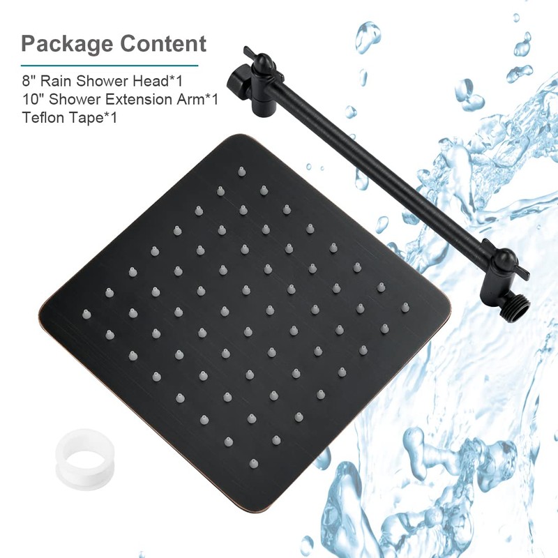 - 8 INCH RAINFALL SHOWER HEAD -- Luxury 8 inch rain shower head which is just right, not too large and waste of your space compared with 10 inch or 12 inch. 304 stainless steel construction finished with gorgeous oil-rubbed bronze which is rust-resistant and durable