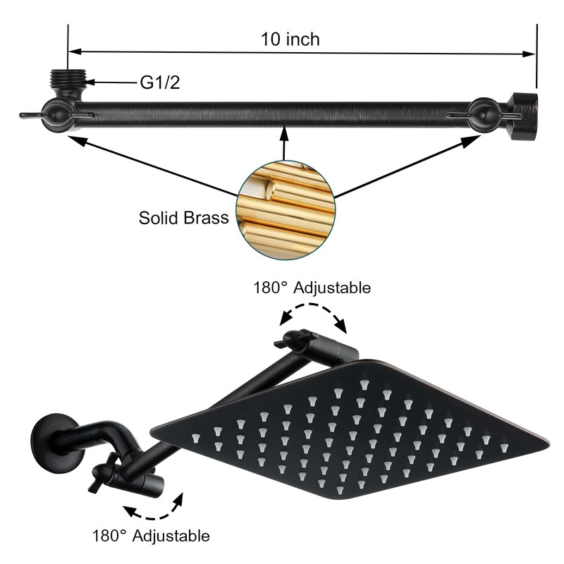 - 10 INCH ADJUSTABLE SHOWER ARM EXTENSION -- Made of solid brass with well-fortified gear joints that can hold this square rain shower head securely in any position for the perfect shower experience