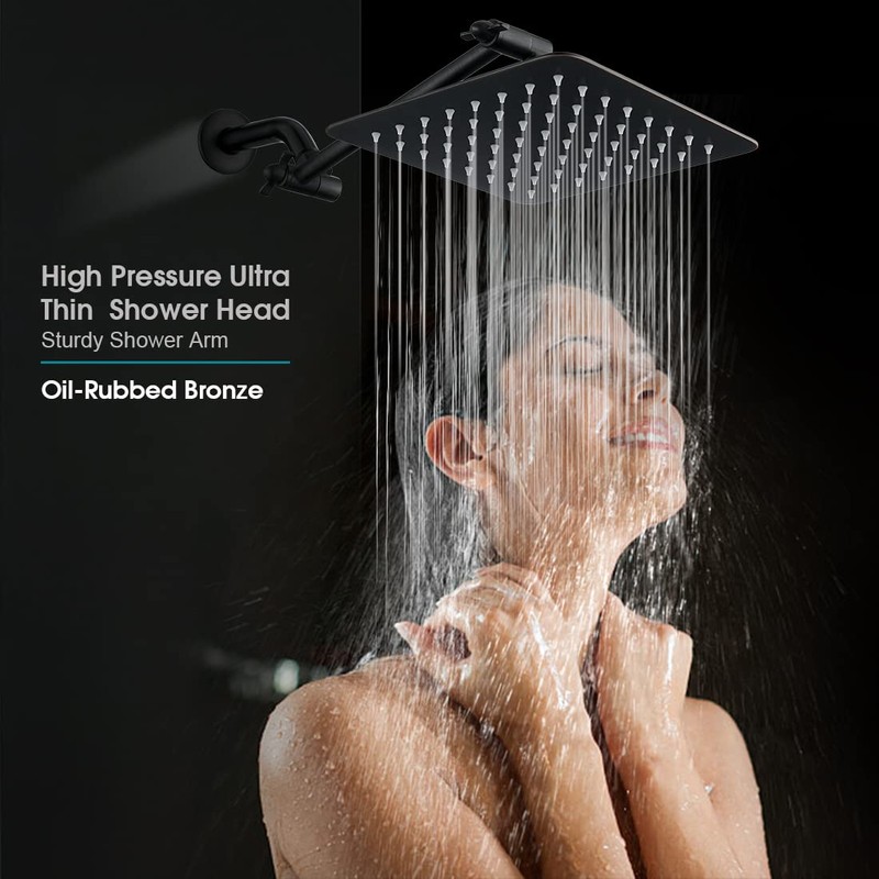 BRIGHT SHOWERS Rain Shower Head with 10 Inch Adjustable Extension Arm Combo, 8 Inch High Pressure Stainless Steel Rainfall Showerhead, Ultra Thin Square Design Easy to Install, Oil-Rubbed Bronze