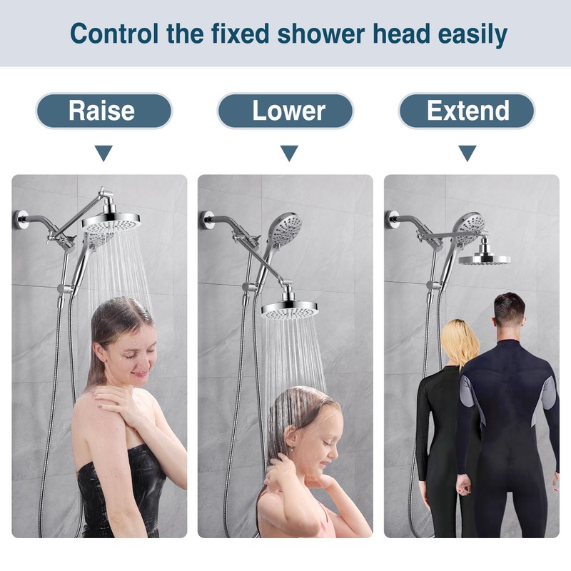 BRIGHT SHOWERS Rain Shower Head with Handheld Spray Built-in Power Wash, High Pressure Dual Shower Head with Height Adjustable Extension Arm, 3-Way Diverter, 9 Settings Handheld, 69” Long Hose, Chrome