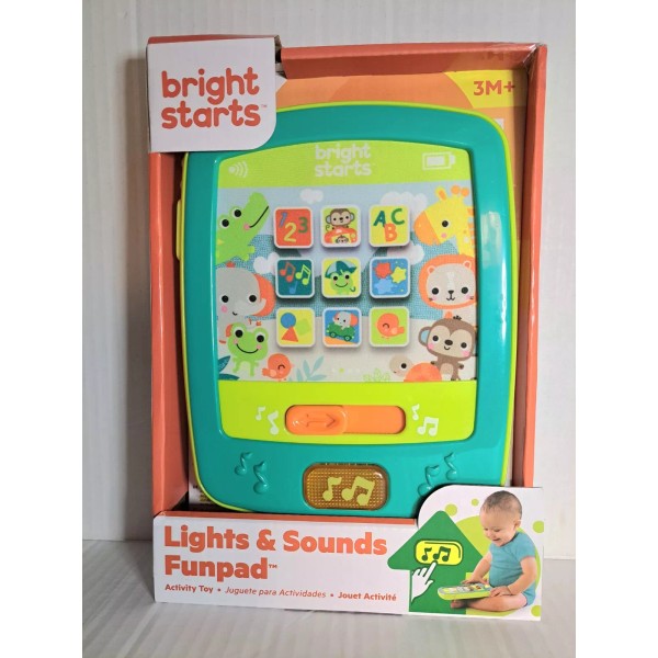 The Bright Starts Lights & Sounds Fun Pad Activity Toy is designed for babies aged 3 months and older. This interactive toy features a tablet theme with bright colors and engaging lights and sounds to stimulate hand-eye coordination, motor skills, and creativity. Made by Bright Starts, this activity toy is a unisex product that is manufactured in China. Perfect for early development, this toy provides a fun and educational experience for infants as they explore and play.
