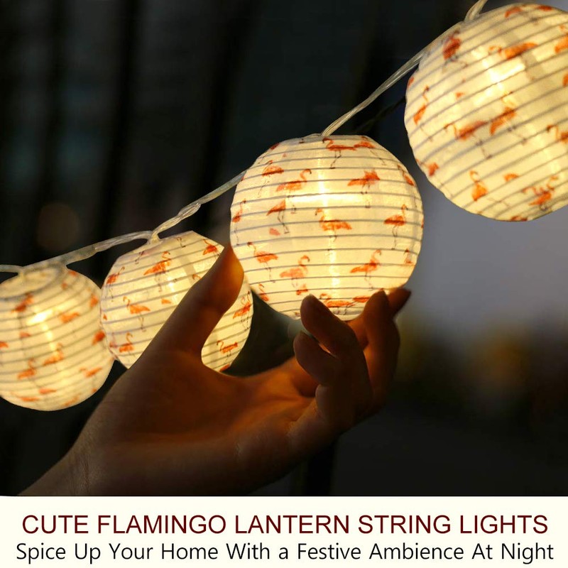 - MAKE YOUR HOME STUNNING WITH LANTERN STRING LIGHTS, DAY & NIGHT - This 20 Feet battery operated lantern string light consists of TWO 10 Feet string lights, each lined up with 15 mini LED lanterns (total 30 lanterns) - Embellished with tranquil presence of flamingos, these lantern string lights exclude the spiritual essence of love and create an instant tropic theme in the day - Warm white LED glow automatically lights up flamingo lanterns, spicing up your home with a festive ambience at night.