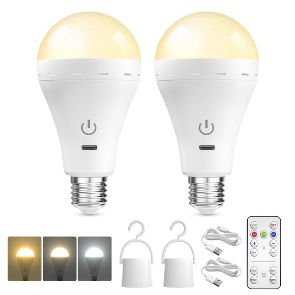 BrightArk E26 Rechargeable Led Light Bulbs with Remote, 3 Colors Dimmable E26 Battery Operated Light Bulb with Timer, Emergency Rechargeable Light Bulbs, Up to 35 Hours, 2 Packs