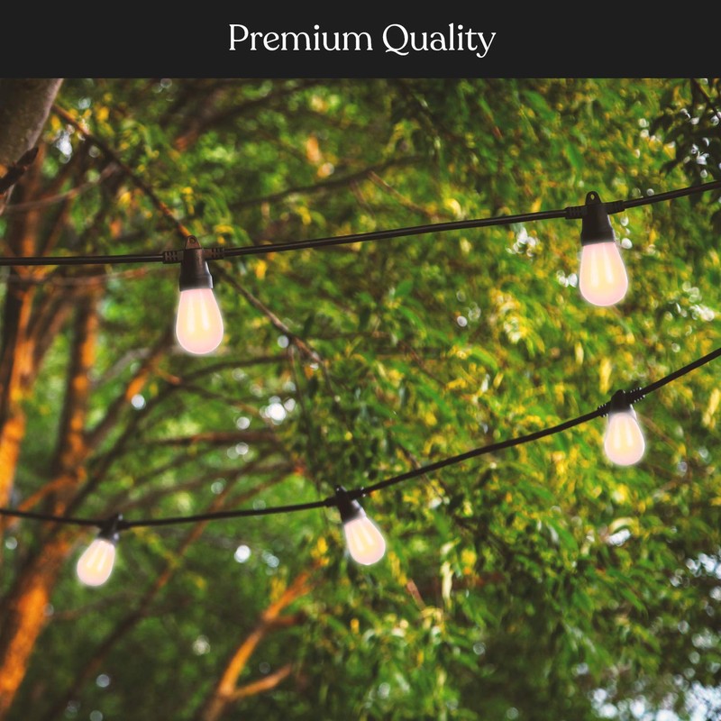 - Commercial Grade WeatherProof Patio Lights with Shatterproof S14 Bulbs: Brightech’s Ambience Pros hanging lights string contains our WeatherTite technology - withstood winds up to 50MPH, rain & snow. The bulbs are shatterproof plastic shells, with heat resistance up to 122 degrees Fahrenheit. Flexible heavy-duty cord withstands the wear of indoor and outdoor use. Enjoy until late: They last 5-6 hours on a full charge, i.e. 6 hours of direct sunlight.
