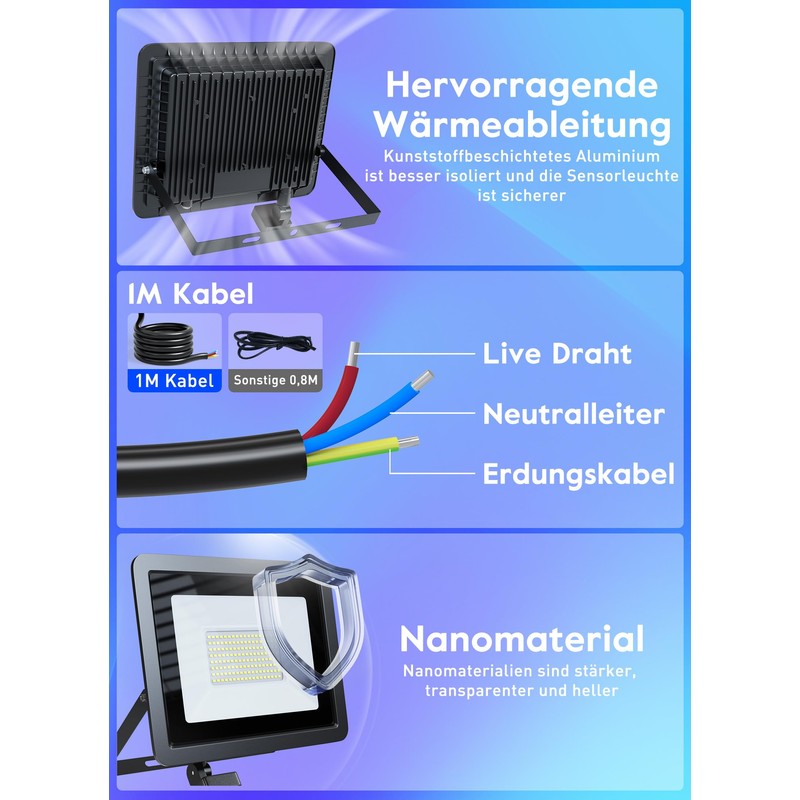 - LED headlight with motion sensor: use high-quality chips as a light source. With 36 ultra-bright LED chips and a 120° beam angle, it stably produces a brightness of up to 3000 lumens (6500K cool white), which corresponds to a 300W incandescent bulb equivalent. The spotlight has a high energy conversion efficiency and saves more than 85% on electricity costs