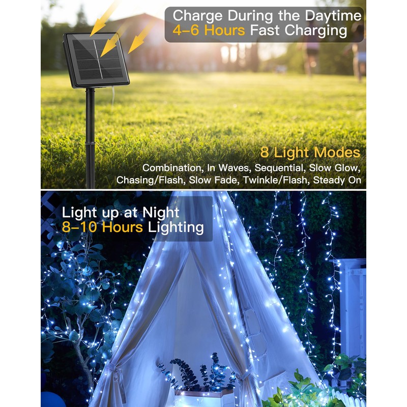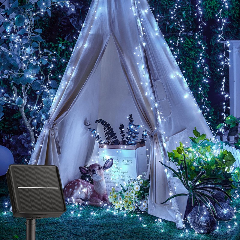 - Solar Lights Outdoor - 9.8 feet outdoor tree lights with 120 bright LED lights. The solar fairy lights produce a pure white glow, fit well in your porch, garden, yard, patio, balcony