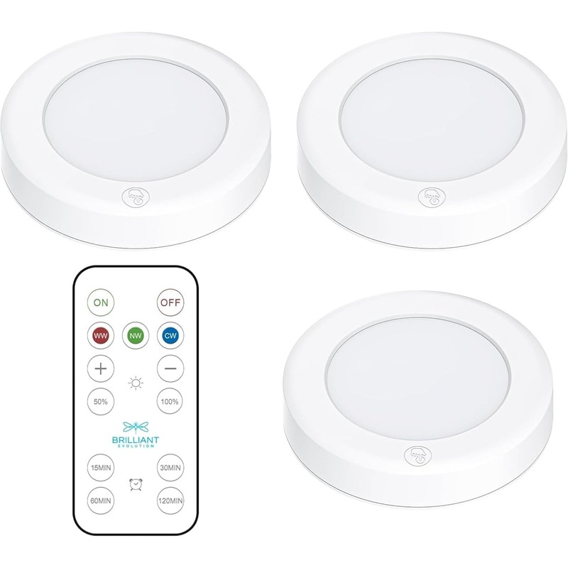 Brilliant Evolution Wireless LED Puck Lights with Remote Control, 3 Pack - Under Cabinet, Closet Light - Battery Powered - Under Counter Lighting - Stick On Lights - Under Counter Lights