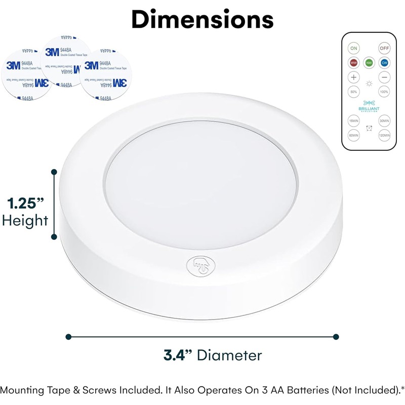 - MOUNTING TAPE & SCREWS INCLUDED - Install your new battery-operated Brilliant Evolution led puck lights with remote control in seconds with either the heavy-duty adhesive tape or screws (both options included).