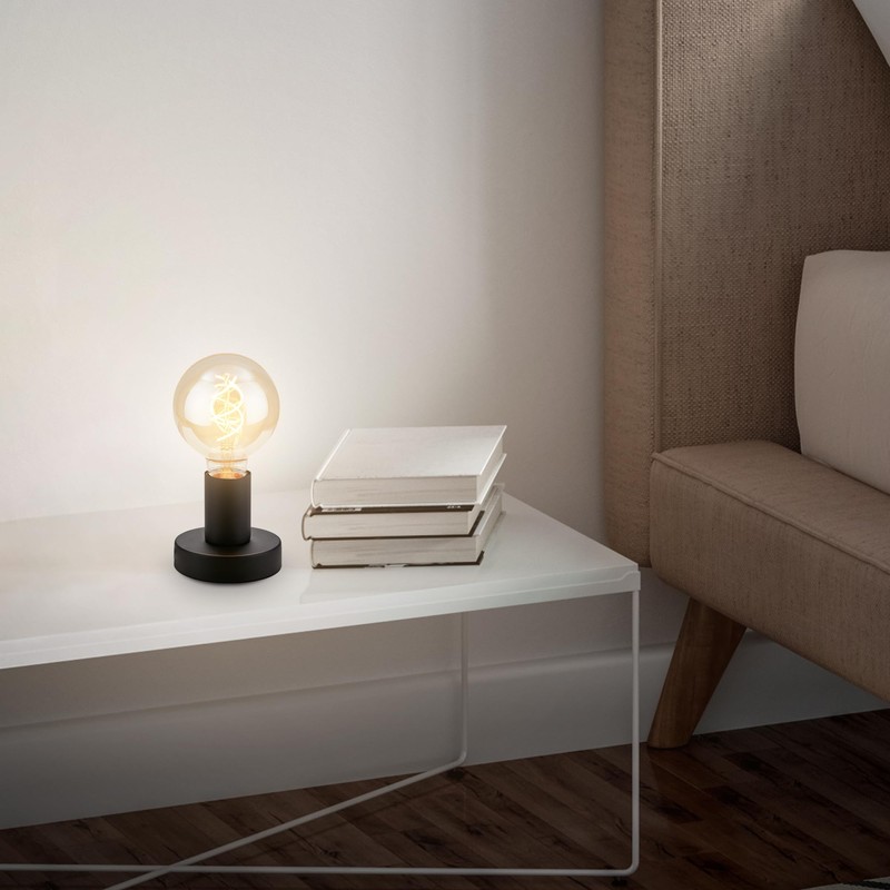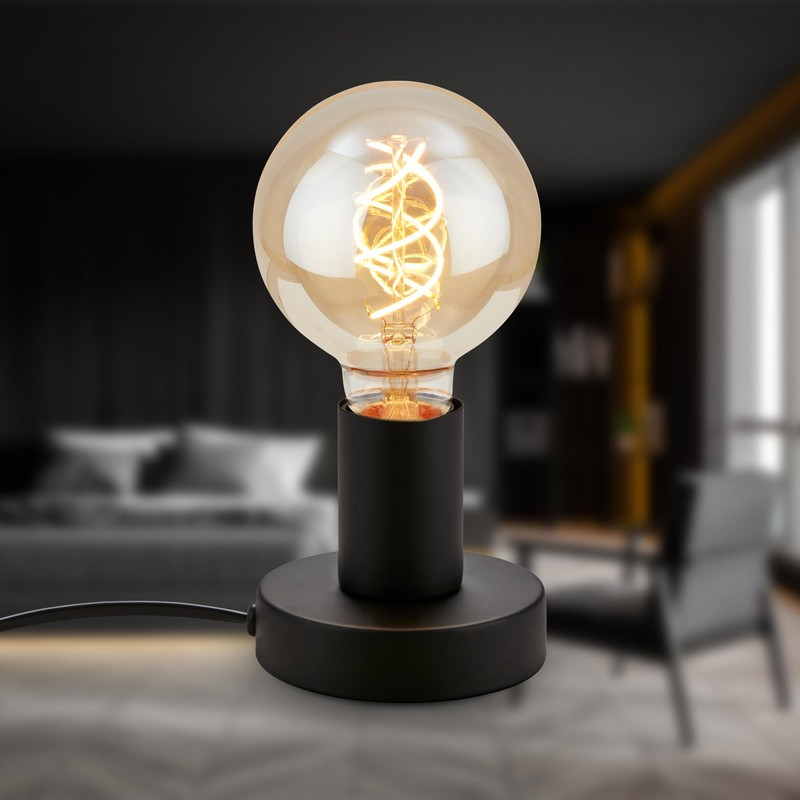 Diese 1-flammige vintage Tischleuchte in der Farbe schwarz wird durch ihre Retrooptik zu einem Highlight in Ihren R?umen. Die Tischlampe ist vielseitig einsetzbar, z.B. als Nachttischlampe oder Schreibtischlampe und wertet auch Ihr Zuhause optisch auf. Lichtfarbe und Helligkeit k?nnen Sie bei dieser Leuchte individuell bestimmen und so eine auf Sie abgestimmte Atmosph?re und Ausleuchtung schaffen C das Leuchtmittel ist im Lieferumfang nicht enthalten. Die maximale Wattage fr diese Tischleuchte betr?gt 10 Watt (E27-Fassung). Durch die Schutzart IP20 ist sie ausschlie?lich fr den Einsatz im Innenbereich vorgesehen. Produktabmessungen: 100x90mm (DxH)"