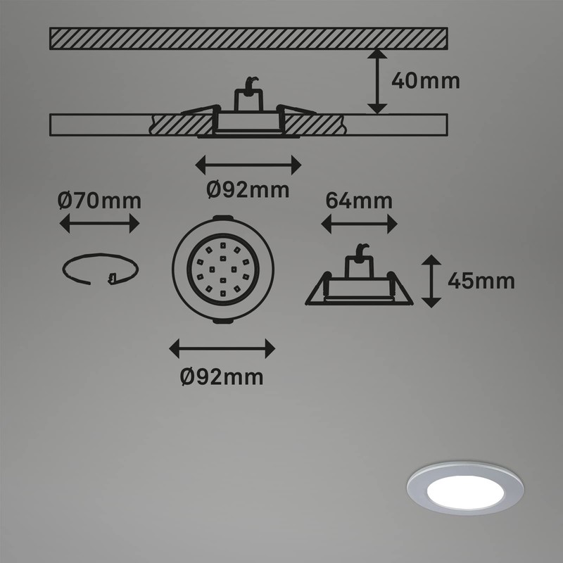 - The protection class IP65 protects the LED spotlights from jet water. You will receive the recessed ceiling lights for the bathroom in the dimensions of 92 x 45 mm, with a installation dimension of 68 x 40 mm. With 4.8 watts each at 450 lumens, the bathroom lighting provides plenty of brightness.