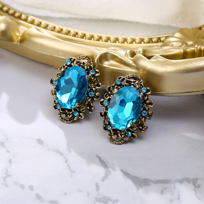 BriLove Victorian Style Clip On Earrings for Women Blue Crystal Floral Cameo Inspired Oval Earrings Antique-Gold-Toned
