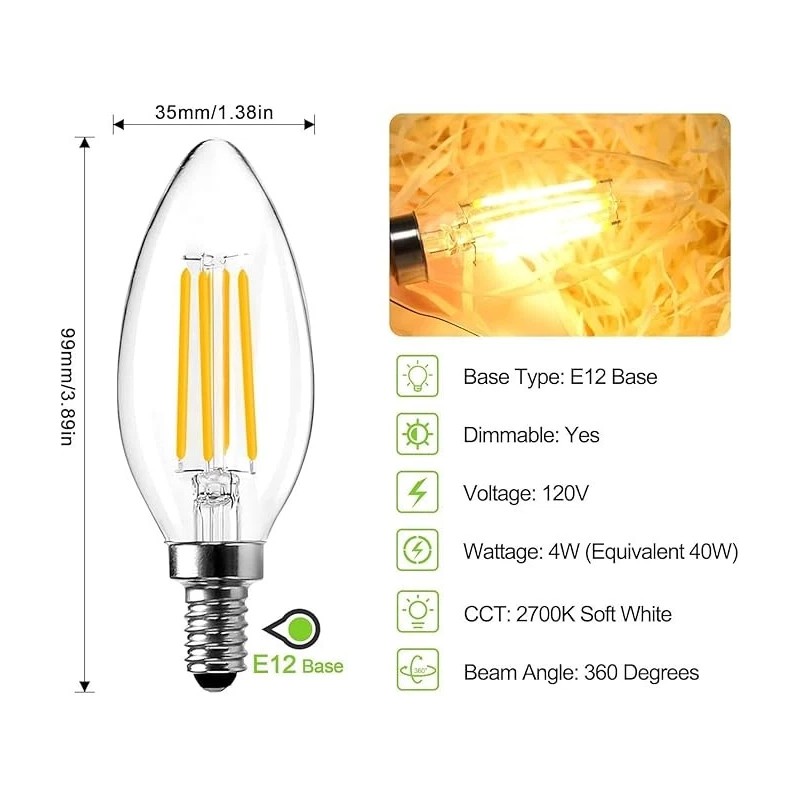 Clear glass LED bulbs with the standard E12 base which fits the most popular sockets in the USA, Easily screw into decorative light fixtures like chandeliers, candelabras, wall sconces, etc.