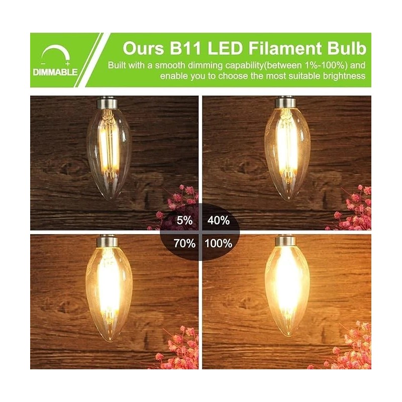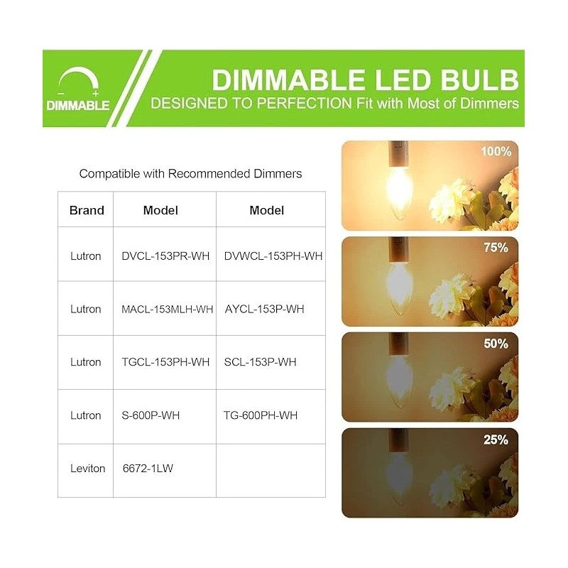 ✅【Deeply Dimmable】 Enjoy adjustable brightness with our C35/B11 dimmable LED bulbs. Suggested compatible dimmer models: DVCL-153PR-WH, MACL-153MLH-WH, TGCL-153PH-WH, S-600P-WH, DVWCL-153PH-WH, AYCL-153P-WH, SCL-153P-WH, TG-600PH-WH, 6672-1LW