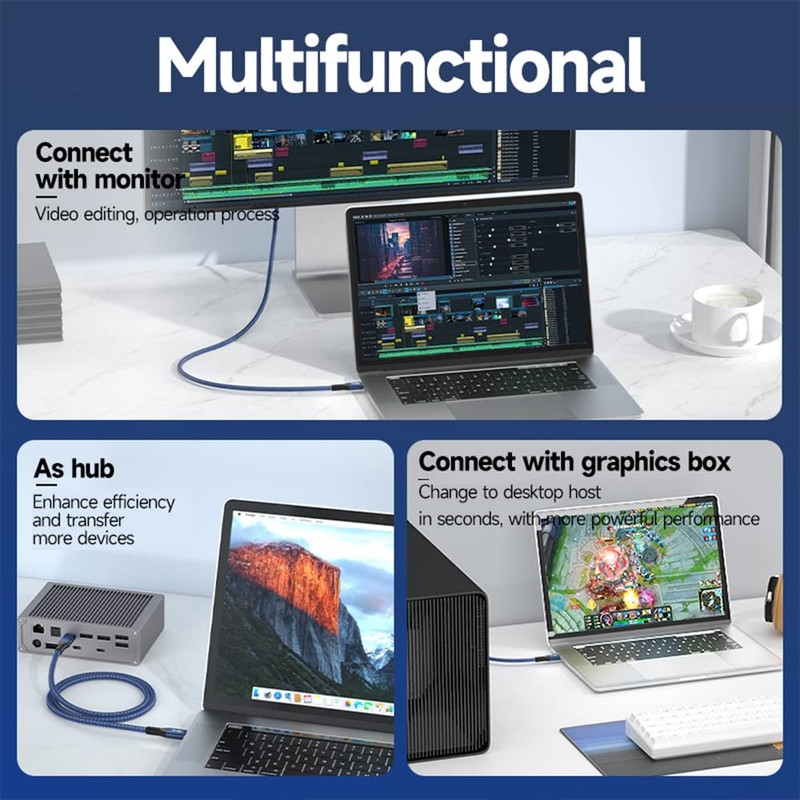 - 【Coaxial Silver-plated Core Thunderbolt 4 Cable】The Thunderbolt 4 cable boasts a transfer speed of up to 40Gbps. It can not only provide power to compatible devices simultaneously, but also charge them in reverse. This cable supports connecting laptops, Mac Studio, external graphics cards, daily connectivity cables, headphones, keyboards, mice and any other Thunderbolt/USB4-enabled devices, providing great convenience for mobile work and business trips.
