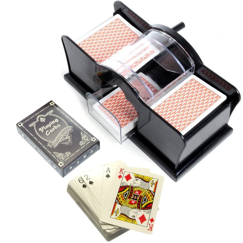 - Manual card shuffler, no batteries required.