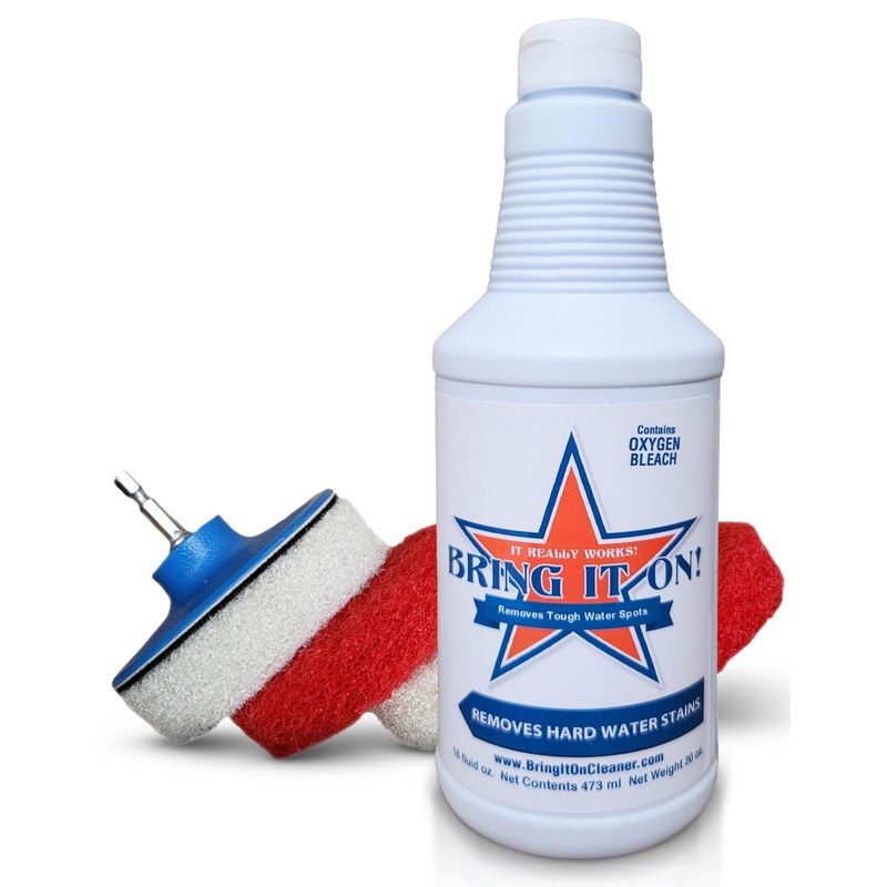 Bring It On Cleaner Hard Water Stain Remover for Glass, Soap Scum remover for Shower glass, Fiberglass, Windows, Tile and Grout Cleaner, Water Spot Remover for Glass Includes Scrubbing Drill Pads