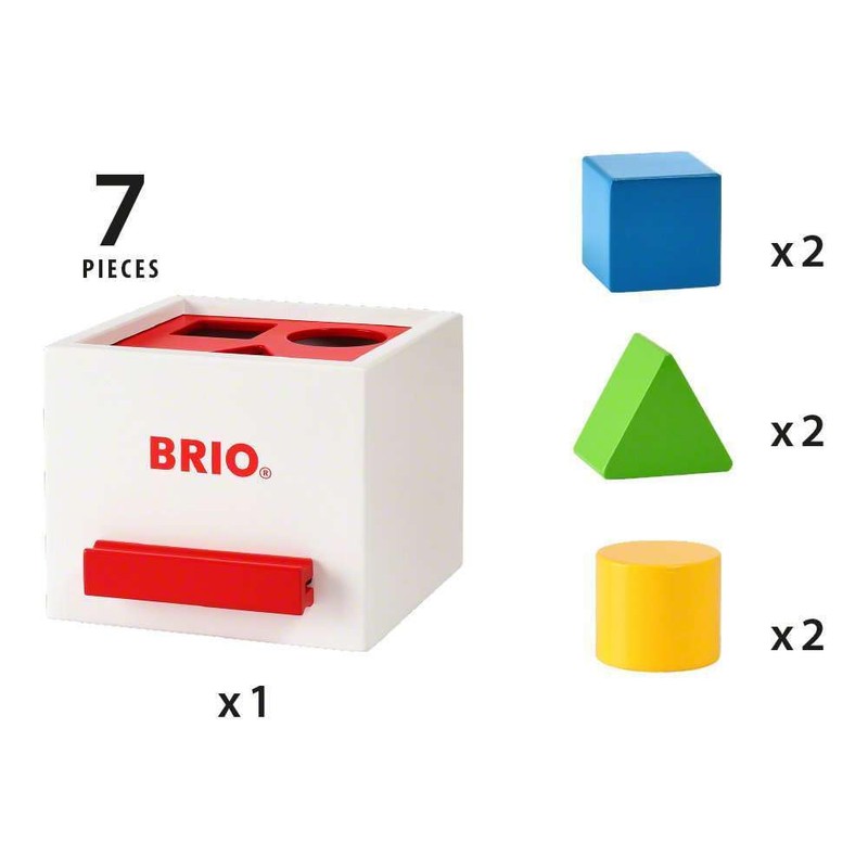 - Classic BRIO sorting box with drawer and six three-dimensional wooden shapes for sorting.