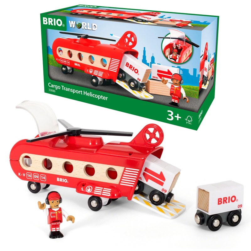 - Lift & Load: This is a new large helicopter for transporting cargo items. Nothing is more exciting than an air trip with a helicopter. Loading the wagon, put the pilot, and you're ready to go, then turn the helicopter spinning wings to take off. Playing in Brio will stimulate children's creativity, develop logical thinking and motor skills