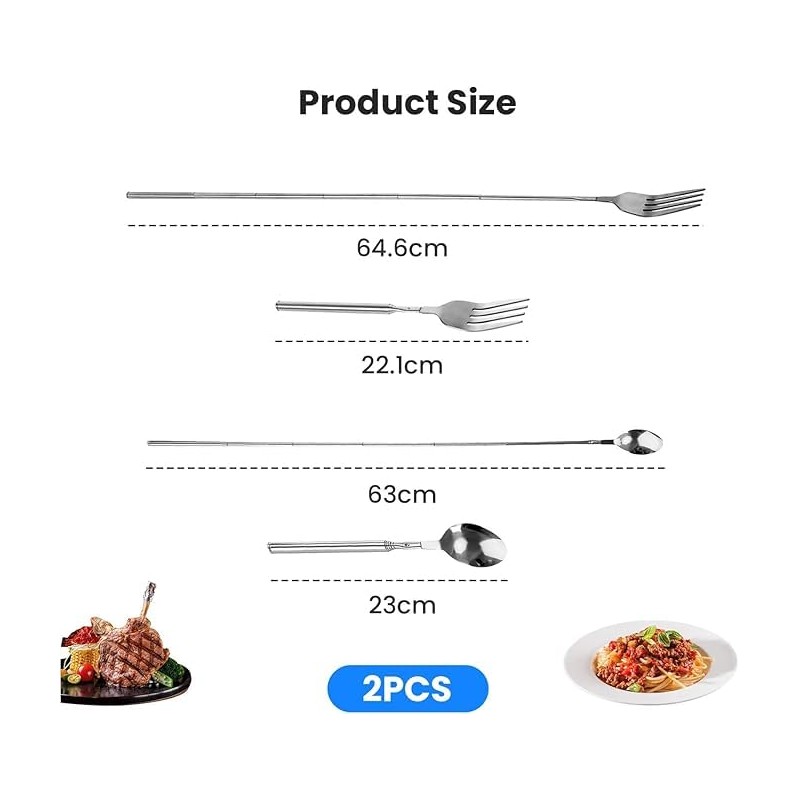 - Retractable Design: The extendable fork and spoon are easy to use, sturdy and durable. The length of the extendable fork can be adjusted from 22-64.6cm and the length of the extendable spoon can be adjusted from 23-63cm. You can adjust the length of the fork and spoon to suit your needs
