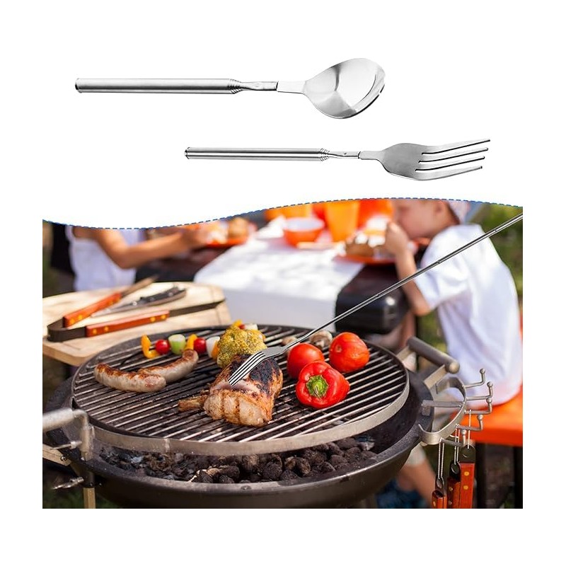 Smooth Telescopic Mechanism – Effortlessly adjust the long-handled fork and spoon to reach distant food items, making them ideal for serving desserts, fruits, and meats.