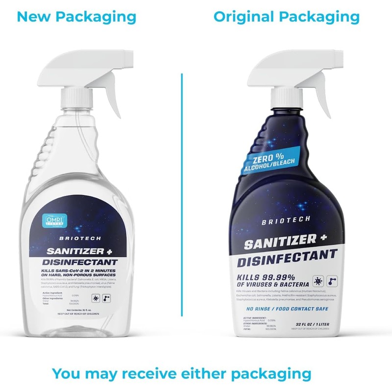 BRIOTECH Sanitizer + Disinfectant, Kills 99.99% of Viruses & Bacteria, HOCl Hypochlorous Spray, 0% Bleach, 0% Alcohol, Food Contact Safe, Eliminate Non-Living Allergens & Remove Pet Odor