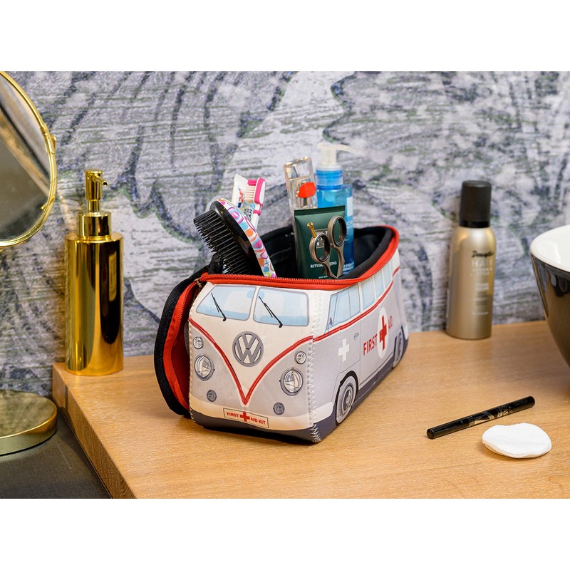 - FIRST AID Groß: die T1 Bus Kosmetiktasche ist ganz in hellgrau und weiß gehalten und mit Rettungskreuzen, sowie dem weißen Schriftzug "First Aid" versehen. Ein cooles Detail sind die Zipper Puller in Bus Form. Die Tasche misst 30 x 14 x 12 cm.