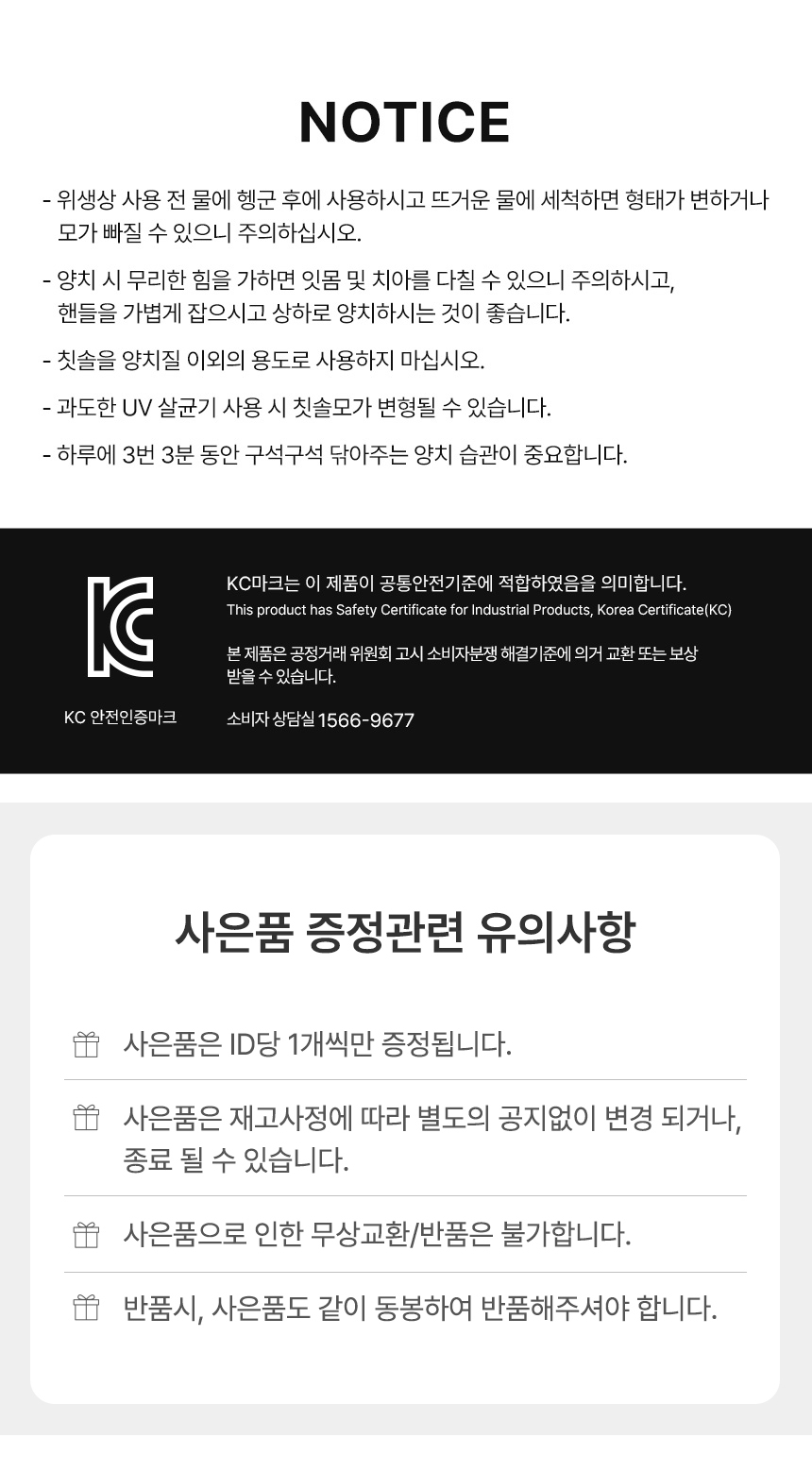 | 취급방법 및 취급시 주의사항/ 안전표시 | 1. 위생상 사용 전 물에 헹군 후에 사용하시고 뜨거운 물에 세척하면 형태가 변하거나 모가 빠질 수 있으니 주의 하십시오.\n2. 양치시 무리한 힘을 가하면 인몸 및 치아를 다칠 수 있으니 주의하시고 핸들을 가볍게 잡으시고 상하로 양치하시는 것이 좋습니다.\n3. 칫솔을 양치 이외의 용도로 사용하지 마십시오.\n4. 과도한 UV 살균기 사용 시 칫솔모가 변형될 수 있습니다.\n5. 하루에 3번 3분 동안 구석구석 닦아주는 양치습관이 중요합니다. |