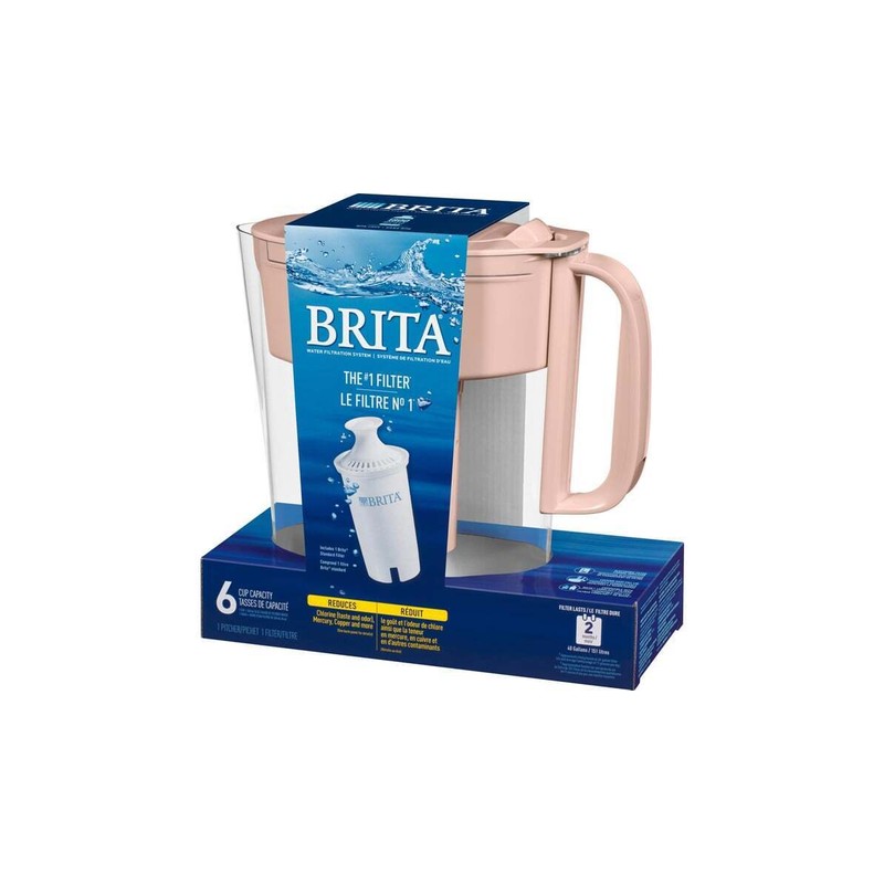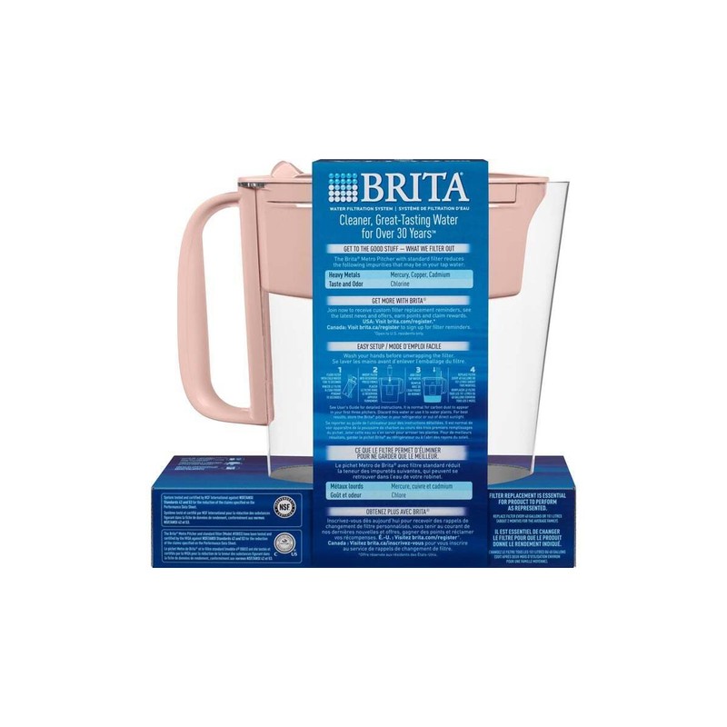 Drink healthier, great-tasting tap water with the BPA-free, small 6-cup Brita Metro Water Filter Pitcher. This filter water pitcher cuts the taste and odor of chlorine, plus it reduces copper, cadmium and mercury impurities, to deliver great-tasting drinking water. By switching to this Brita filter, you can replace 1,800 single-use plastic water bottles a year to stay hydrated, save money and reduce plastic waste. This filtered water pitcher features an easy-fill locking lid that helps prevent unwanted spills and allows for effortless pouring and refilling. An electronic filter indicator on this water purifier pitcher lets you know when it is time to change the Brita filter. Get great taste, less waste and more savings from Brita.