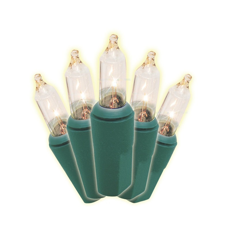 This box contains 100 count mini CLEAR LIGHTS on GREEN WIRE. This strand is 22. 4' long, including a 18" lead cord, 2. 5" spacing and a 3. 5" end cord. If one bulb goes out, the others will stay lit on this set. Replacement bulbs and fuses included. Each string has an end to end connector for adding on light sets for any sized decorating project. UL listed, Suitable for either indoor or outdoor use.