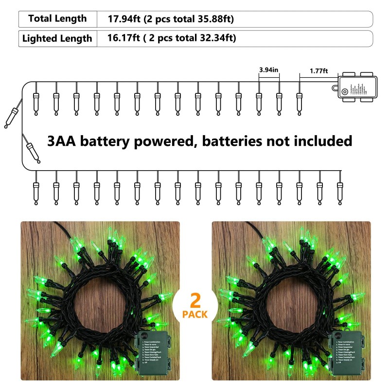 2 x 50 LED Green Lights: Green wire green christmas lights with 50 led green light bulbs, emits a super pleasant bright green glow. Enhancing your indoor & outdoor decorations in every season.